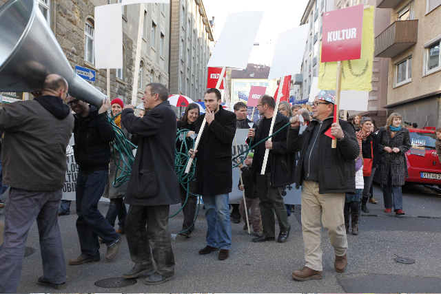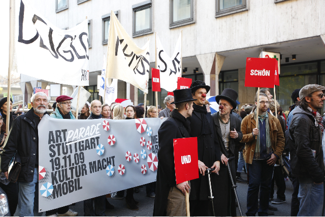 Als Antwort auf die Ankündigung der Stadt Stuttgart, den Kulturhaushalt zu kürzen, hat der Verein kunst08+ e. V. die Stuttgarter Art Parade ins Leben gerufen. Alle, denen Kunst und Kultur in Stuttgart etwas bedeuten, waren aufgerufen, sich zu beteiligen.