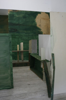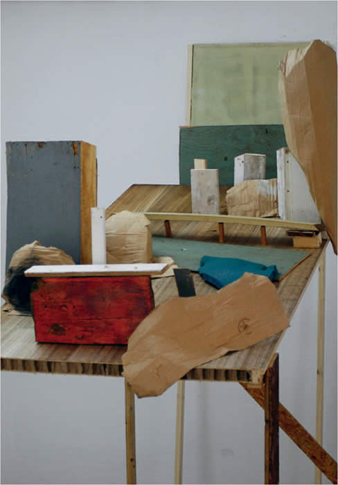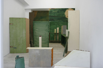 The use of daily roughly worked materials like paperboard, plastic or wood, reconducts to simplified and again easily identifiable linguistic forms. Like in raree shows the installation consists of subsequently ordered coulisse frames, which reinforce the perception of spacial depth. This way the elements of the installation »Landscape with storm« gradually combine to recreate a specific Renaissance's landscape. The coulisse character of the composition finds its counterpart in the particular aspect of the exhibition's space, recalling a theatre stage with its ascending floor. To the viewer watching from the outside into the gallery room the installation appears like a flat picture. To those who enter the room a more complex landscape discloses: single elements become slowly visible, the picture demounts as the installation's hidden skeleton is unveiled to the public view. This way »Landscape with storm« becomes a transition point between installation and picture, between a planar and a three-dimensional perception.