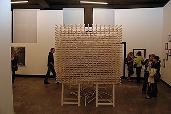 Claudia Kuglers digital erstellte Videoarbeiten scheinen unseren Blick ins grüne Dickicht ihrer fiktiven Räume hineinziehen zu wollen, um ihn im entscheidenden Moment, kurz vor der nächsten Biegung, an der Flächigkeit ihres digitalen Konstruktes abgleiten zu lassen. Zusammengesetzt aus einzelnen Versatzstücken einer Landschaftsfotografie, die auf unterschiedlichen Bildebenen gebracht und gegeneinander verschoben werden, suggerieren ihre Bilder wandernde Blicke in Unmöglichkeitsräumen. In Florian Neufeldts Stapel – einem aus einer Unmenge exakt gereihter schmaler Holzlatten gebildeten, übergroßen, dabei auf vier Holzböcken scheinbar kaum zu lastenden, sondern vielmehr im Raum schwebenden Kubus – begegnen wir einem sorgsam komponierten Spuk. Je nach Perspektive lässt sich feststellen, dass Kräfte an dem hölzernen Gestell gewirkt haben müssen, welche die Ordnung allein im Zentrum zerstören konnten, wovon noch einige am Boden liegende Belege zeugen.