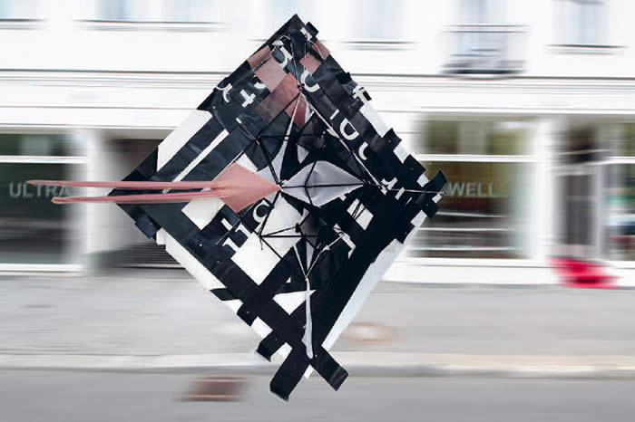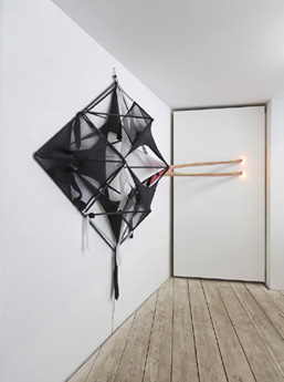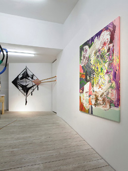 Die Berliner Künstlerin Isabel Kerkermeier verwendet für ihre installativen Objekte industriell produzierte Gegenstände wie Stahlrohrmöbel und Werbebanner, die eigentlich am Ende ihrer Nützlichkeit angekommen sind. Rekombiniert mit bunten Seilen, Nylonstrümpfen und Expandern werden sie zu Skulpturen und Wandobjekten. Da die Neukonstruktion nachvollziehbar ist, bleibt die Anmutung des Mobiliars unweigerlich erhalten und stellt vertraute Bezüge zum menschlichen Körper, seinen Proportionen und Bewegungen her, während die ursprünglichen Reklamebotschaften der Banner zu neuen, ästhetischen Inhalten verdichtet, vermischt und zerfasert werden. Gleichzeitig geraten die elegant und filigran ausgreifenden Objekte aber selbst in Bewegung. Sie verlieren ihre technoide Sprödigkeit und materielle Schwere und schweben als rhythmische Form- und Farbassemblagen im Raum. Die Kunststoffbahnen und bunten Seile bilden ein dichtes Geflecht aus Linien und Flächen, das sich quasi nahtlos in die assoziative Vielschichtigkeit der Gemälde fortsetzt. Bettina Schönfelder.