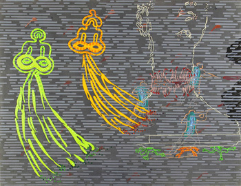 Die aktuellen Arbeiten der aus Georgien stammenden und in Stuttgart lebenden Künstlerin Keti Kapanadze begründen eine neue Phase ihres malerischen Schaffens. Die Bildfläche ist durch vielgestaltige, teilweise bunt aufleuchtende, sich wiederholende Elemente dynamisiert. Die transluzierenden Schichten ihres Malgrundes geben der darauf liegenden Farbe eine eigene Tiefenräumlichkeit, die den Eindruck bunten Lichtes, von Flüchtigkeit und Informationsüberflutung noch verstärkt. Die Schatten der Farben mischen sich so ein und erwecken den Anschein eines Piccadilly Circus bei nächtlichem Regen – eine Art der Hyperrealität. Es sind Bildelemente, die scheinbar ohne Hierarchie phantastisch komplizierte Strukturen ausbilden. Die hierin auftauchenden Zeichen, im ersten Moment eindeutig – fliegende Buddhas, schießende Menschen, kriechende Eidechsen – lassen sich in kein lineares Narrationsschemata bringen, noch sind sie eigentlich lesbar. Sie schwirren im Raum, ihres Referenten verlustig, kleben sie an der Oberfläche einer genuin künstlichen malerischen Welt. Keti Kapanadze war zuletzt in den Gruppenausstellungen »Suspended« im Neuen Kunstforum Köln, »I’m not a suicidor« im Museum am Ostwall Dortmund, »Born in Georgia« im Cobra Museum Amsterdam und »Bildschön« in der Städtischen Galerie Karlsruhe vertreten. Das Institut français in Stuttgart widmete ihr unter dem Titel »Bügeleisenschein« in diesem Jahr eine Einzelausstellung.