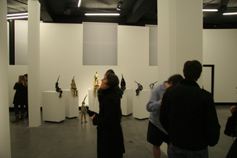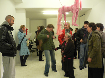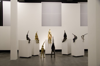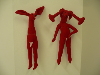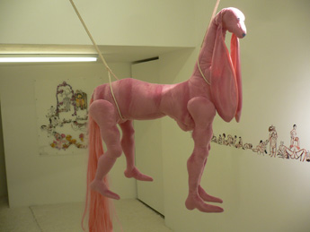 Lidy Jacobs' Sculptures are stuffed animals. Different from the gender-free models, in which one finds in certain societal norms, Lidy Jacobs' sculptures are sexualized.Even if her elaborately designed stuffed animals are not taken from any world which is familiar to us from our childhood, they nevertheless point back into our infancy and show thus clearly the repressed parts of psychological processes of early childhood in an adult. In her installations, Lidy Jacobs creates scenes which with the first glance appear infantile, yet these libidinous structures refer to something that she accepts as fundamental in our society.