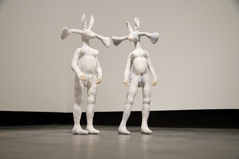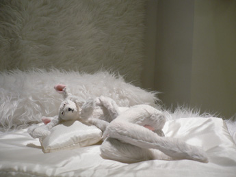 Die Berliner Rauminstallation ’Rabbit Bedroom’ präsentiert sich als überaus kuscheliges Gemach, in dem sich zwei Mischwesen aus Stoff befinden. In der Aufhebung einer alltäglich vertrauten räumlichen Struktur und Dingwelt - nur angedeutet sind beispielsweise Bett und Stuhl - geht alles in der Weichheit der Flokati-Oberflächen ineinander über, das Mobiliar verschmilzt mit dem umgebenden Raum, die Wände mit den horizontalen Flächen wie Boden und Decke. In einer verschobenen Maßstäblichkeit, auf einem für es viel zu groß erscheinendem Bett liegt ein schutzbedürftig wirkendes, in sich zusammengerolltes chimärisches Wesen aus Kaninchen und Mensch. Für dieses unerreichbar hoch an der Wand wartet ein negligéartiges Bunny-Kostüm an einem Kleiderbügel hängend auf seinen Auftritt im Scheinwerferlicht. Statt begehrlicher Blicke und Scheinwerfer richten sich jedoch nur die sanften Augen des Kentaur ’Irene’ auf das Hasenmenschlein – diese wiederum ein Mischwesen aus Pferd, Mensch und Hase. Im Blick und in der Haltung von ’Irene’ manifestiert sich die Ambivalenz dieser Szenerie: Die detaillierte Ausarbeitung der Geschlechtsteile des Kaninchens, das als Anthropomorphismus üblicherweise den Stereotypen roher Triebhaftigkeit und übermäßiger sexueller Aktivität umschreibt, die plüschigen Materialqualitäten des Flokati, die aufreizende Erscheinung der Dessous an der Wand – all dies könnte auf eine Atmosphäre des sexuell Begehrlichen verweisen. Die schutzsuchende Liegeposition des Häschens, der sanftmütige Blick und die andächtige Haltung von ’Irene’ offenbaren jedoch ein scheinbar anders geartetes Begehren: Ein Verlangen nach Überbrückung der Distanz, nach Berührung, Anerkennung, Erfüllung und Geborgenheit. So versetzt Lidy Jacobs ihre Wesen in eine geradezu religiös anmutende Szenerie, die an Darstellungen der Anbetung des Kindes erinnert. Ihre chimärischen Schöpfungen gruppieren sich zu einem Andachtsbild, das – nicht ohne ein Augenzwinkern - Vergegenwärtigungen tief verborgener Sehnsüchte und Wünsche erlaubt: nach unmittelbarer Triebbefriedigung, der Auflösung von Grenzen, nach der Rückkehr in einen Urzustand vor der Trennung und vor der Unterscheidung von ’ich’ und ’du’ – der Rückkehr in einen schwebenden Zustand, der mit Freud als frühkindlicher Zustand des Vereint-Seins gedacht werden kann.