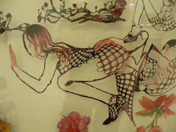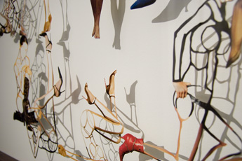 Die Themen der 1959 in Heerlen/Niederland geborenen Lidy Jacobs kreisen um obszöne und kindliche Verdrängungsmuster unserer Gesellschaft. Dabei bedient sie sich in ihren Arbeiten einer Mischform aus Collage und Scherenschnitt, der Fotografie sowie der Skulptur. Das Bildmaterial für ihre Collagen entnimmt sie sexuell aufgeladenen Werbestrecken und Pornomagazinen. Aus diesen löst sie die einzelnen Körper in einer speziellen Schneidetechnik heraus und entpersonifiziert sie. Die so entstehenden konturenhaften Bildkörper werden in großflächigen Collagen zu einem endlos scheinenden Geflecht miteinander verwoben. In Auflösung der Grenzen zwischen den einzelnen ineinander drängenden und dringenden Körpergerippen entsteht eine neue organisch wirkende Einheit.
