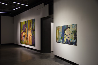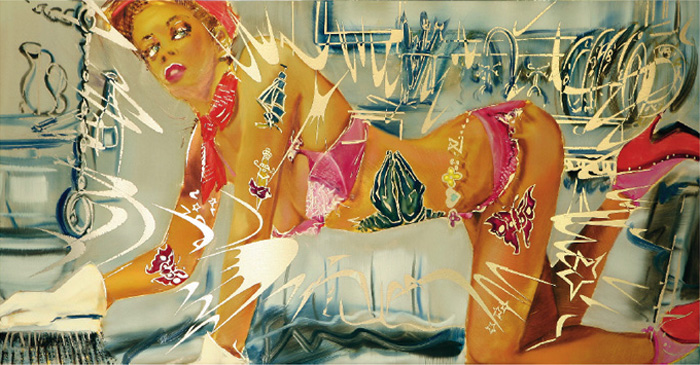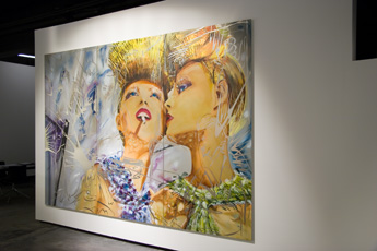 In the choice and combination of his subject matter, Matthias Köster adopts the voyeuristic view of glossy and gossip magazines and brings thus the desirous view as a theme into his paintings. Thus he creates pictures of pictures behind which there is little reality, but rather the sleek surface of a world of make-believe, one of which arouses desire, but never finds fulfillment. The subject matter and the painting technique correspond in as much as the color appears detached from the base, so that it flashes through again and again. With the ground of the painting dematerializing in a mirror affect, the impression of a pure painting emerges, in which color becomes the projection of itself. Matthias Köster’s paintings remind us of both the celluloid of a film reel and the flickering and blackouts of a silver screen after the film is over, together with the after images coming from it. The volatility of his way of painting captures life in the fast lane in a constantly accelerating world of pictures, in which reality only exists as indication of what is real.