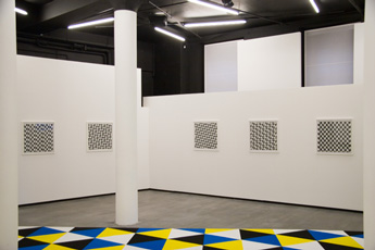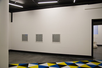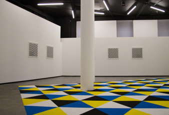 Mittels elementarer Formen konstruiert Tim Stapel grafische und malerische Reihungen, die sich zwar einer zentralperspektivischen Anlage von Raum entgegenstellen, aber dennoch in den perspektivischen Raum vordringen. Neben der Reduktion auf streng komponierte Raster begünstigt der kalkulierte Einsatz von Farbe und isometrischer Parallelperspektive ein permanentes Vor- und Zurücktreten einzelner Formen – eine Dichotomie der Sichtweisen. Für die Galerie Parrotta hat der Künstler eine Bodenarbeit entwickelt, die sich an der Grenze von zwei- und dreidimensionalem Objekt bewegt: Als textiles Gewebe nimmt sie realen Raum ein und behauptet sich dennoch auch als Bildfläche, als ein bildhafter Ausgriff in die dritte Dimension. »Als Maler bin ich an Bildern interessiert. Allein die Tatsache, dass das Bild auf dem Boden liegt, ist für mich spannend. Die Verlagerung des Bildes aus seiner Frontalansicht lässt es verstärkt zu einer Fläche, zu einem Feld aus Längen und Breiten ohne (Bild-)Tiefe ausdehnen. Die flache Fläche stellt andere Anforderungen an das Bild und zwingt zu einer Neubewertung des malerischen Raums. Der räumlichen Situation ausgesetzt entwickelt das Bild gleichzeitig skulpturale Eigenschaften. Es öffnet sich in den Raum und stellt eine Mehransichtigkeit der Bildfläche her. Die Bildstruktur zeigt sich so in unterschiedlichen Form- und Farbkonstellationen. Der perspektivische Bildraum multipliziert sich mit seinen perspektivisch verkürzten Ansichten.« Von einfachen Systemen ausgehend werfen die formstrengen Arbeiten Tim Stapels in ihrer visuellen Vieldeutigkeit nicht abgegoltene Fragen der Konkreten Kunst neu auf. Geprägt wurde der Begriff 1930 in einem Manifest von Theo van Doesburg: Das Bild soll ausschließlich aus plastischen Elementen, d.h. aus Flächen und Farben konstruiert werden und keine andere Bedeutung als sich selbst haben. Trotz konsequenter Reduktion bildnerischer Mittel verweigern sich die Arbeiten Tim Stapels einer solchen Selbstbezüglichkeit. Die elementaren Formen zeigen nicht nur die Abhängigkeit vom Raum und Betrachterstandpunkt, sondern auch eine Aufhebung ihrer perspektivischen Eindeutigkeit.